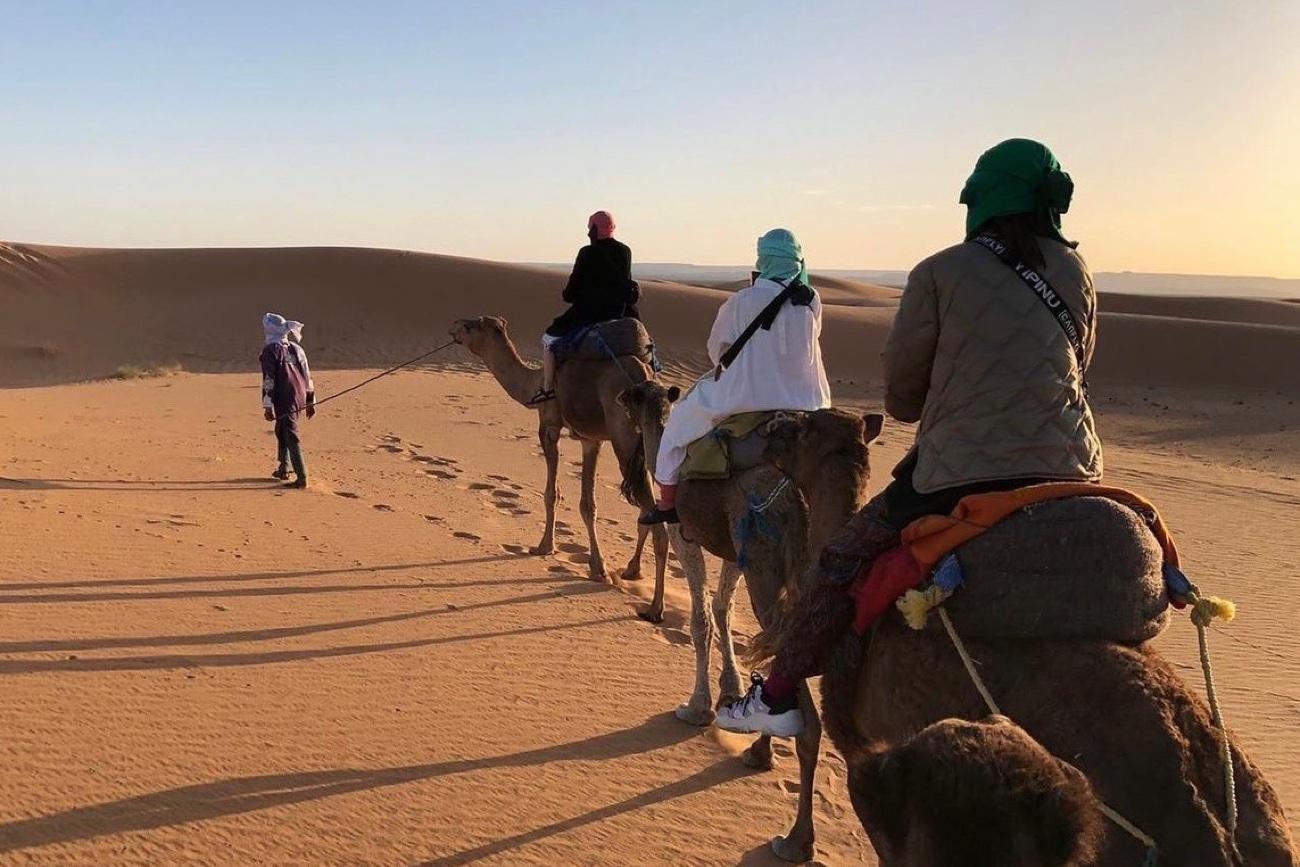 Por la tarde llegaremos a las dunas de Erg Chebbi, donde nos esperan los dromedarios para acompañarnos hasta nuestro campamento de lujo y pasar una noche fascinante bajo las estrellas del desierto.